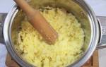 Картофель готов. Сливаем с него всю жидкость. Мнем, добавляем обжаренный лук с маслом. Перемешиваем.